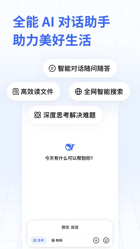 DeepSeek大模型是当前广受认可的国产AI标杆工具,以卓越的语言理解与生成能力,为用户提供流畅自然的智能对话体验。无论是知识检索、逻辑推演、创意构思,还是文件解读与多语言翻译,它都能高效响应、深度解析,真正成为随身携带的AI智囊团,助力用户在学习、工作与日常中事半功倍。