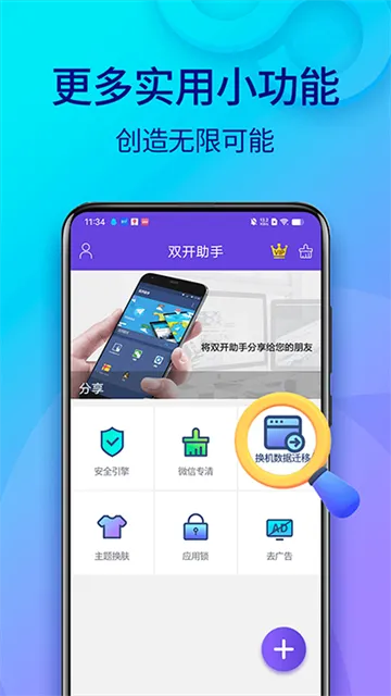 双开助手是超 2 亿用户信赖的应用分身神器,支持微信、抖音、淘宝、手游等全应用双开与无限多开。采用独立虚拟引擎,数据隔离不冲突,消息同步不延迟,兼容新版系统与 64 位应用。自带应用锁、隐私保护,可自定义图标名称,一键添加桌面。稳定流畅不卡顿,无需 ROOT,轻松实现一机多号、生活工作两不误。