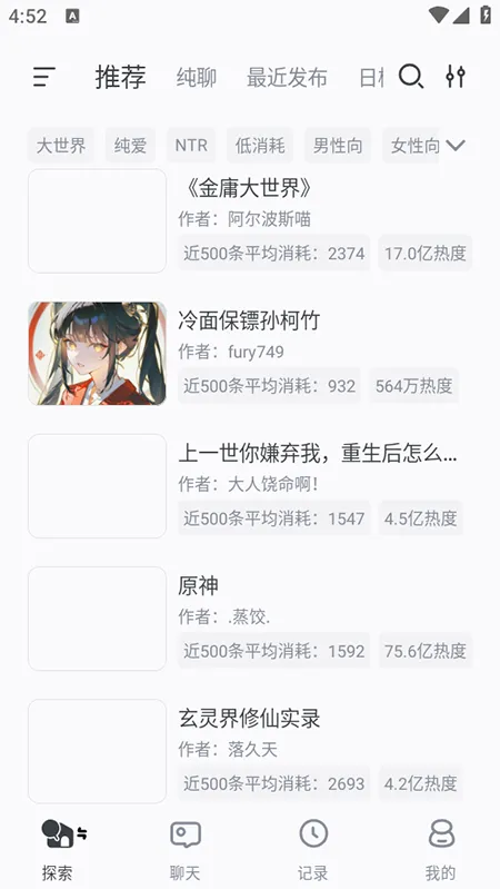 1、用户在AI风月虚拟聊天的【探索】页面可以发现官方和其他用户创作的角色,通过标签筛选能够选择你感兴趣的类型
