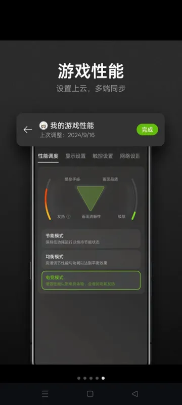 3、在“游戏空间”中上拉可以进入控制台,在这里有3种模式可以选择,分别是“低功耗”、“均衡”和“电竞模式”,如果对打游戏画质延迟等要求比较高的话,推荐选择“电竞模式”。下方还支持“4D振感”、“闪电启动”、“智能游戏提醒”等辅助功能。