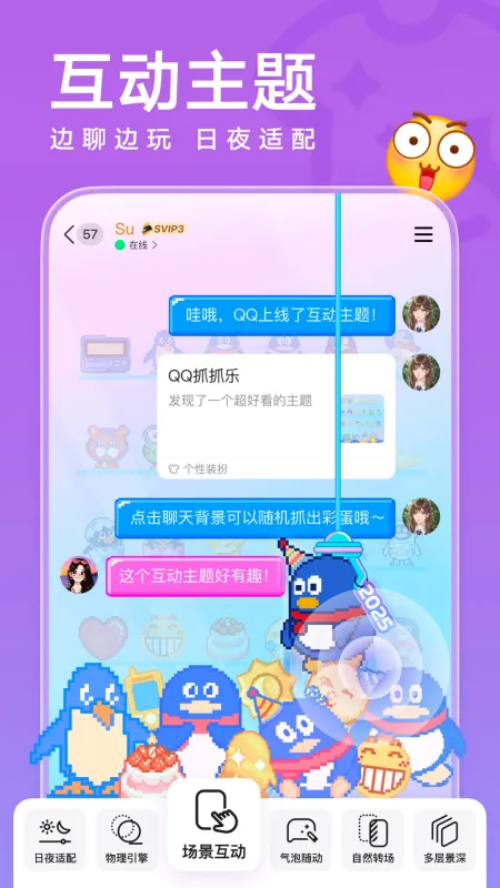 - [个性装扮]主题皮肤、动态名片、趣味气泡、专属挂件随心搭配。