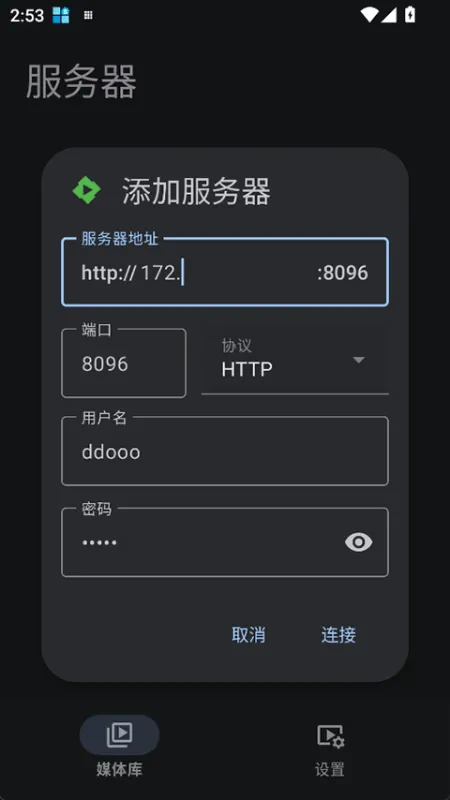 4、点击“+”添加服务器,设置用户名账号和密码并连接