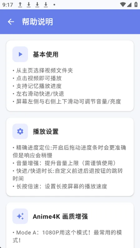 小喵Player是专为动漫迷与高清视频用户打造的安卓本地/网络播放器,基于开源引擎libmpv深度优化,集成Anime4K实时超分辨率算法,可将480p/720p动漫画面智能提升至近1080p/4K清晰度,尤其适配老番、低码率资源的画质修复。它兼顾本地播放与网络串流需求,操作简洁流畅,精准匹配二次元用户对画质的执着——让模糊旧番重焕细腻,低清资源也能呈现通透质感,是提升观影体验的贴心利器。