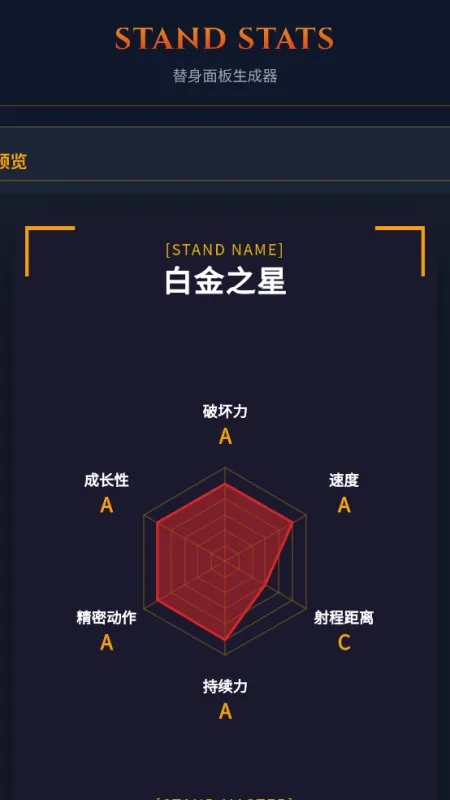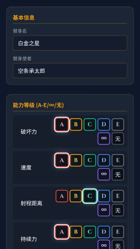 JOJO 替身面板生成器,专为 JO 厨打造的替身创造工具!精准还原动漫六维面板,破坏力、速度、射程、持久、精密、成长全维度自定义。支持随机生成、颜色调整、能力文案编辑,生成高清面板图一键保存分享。界面简洁、操作零门槛,无广告干扰。无论是创作 OC、测试脑洞,还是和同好比拼面板,都能快速实现。化身替身使者,设计你的最强面板,开启奇妙冒险!