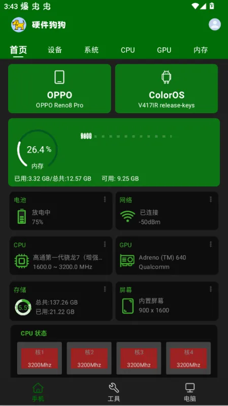 2、多硬件状态监控:对CPU、GPU、电池、网络、存储、屏幕等硬件的状态进行监控。例如CPU方面,可显示如qcom相关芯片,频率在0.0~2865.6MHz之间,还能呈现各核心频率;电池可显示充电状态及电量;存储能显示总共容量和已用情况;屏幕则有内置屏幕分辨率等信息。