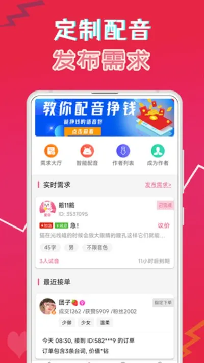 4、最后,进入“预览作者中心”,你就能看到平台上的各种配音订单了。到这一步,你作为作者的入驻流程就全部完成,接下来就可以等待客户来找你下单了。