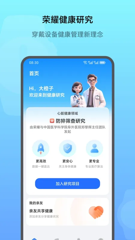 荣耀健康研究APP,以创新科技构建健康管理平台,链接专业健康管理机构与荣耀穿戴用户。