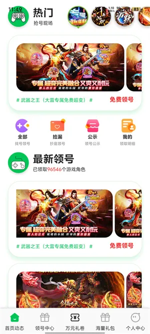 3、点击底部导航栏的领号中心板块,可以按照分类找游戏