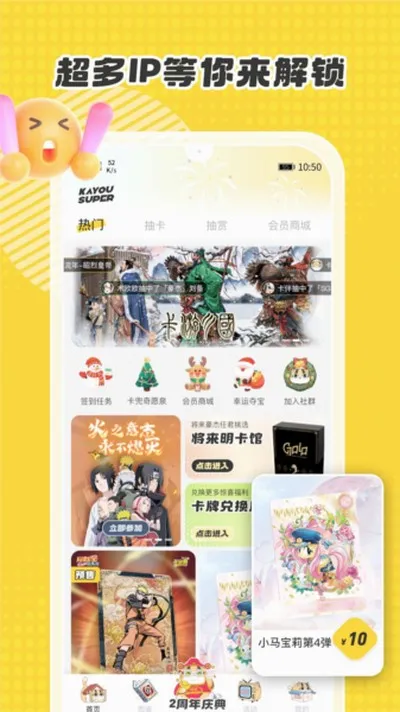 卡游术铂,专业数字集换娱乐平台!官方授权正版卡牌,在线抽取 / 赏玩 / 交换一步到位。打造主题卡包与个性化养成玩法,社区分享收藏心得,开展换卡活动。会员商城享专属折扣与专属卡包,定期上线节日限定活动与福利,助力集卡,构建专属收藏档案。
