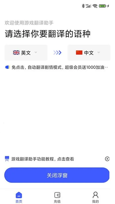 4、接着返回应用,选择要翻译的语种,并启动浮窗。