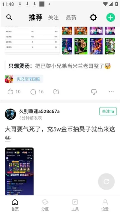 1、分区模块:这块儿就是老哥们吹水的地方,分了实况足球、国服国际服交易、战队招人、现实足球好几个区。平时讨论战术、晒阵容都可以在这儿搞。