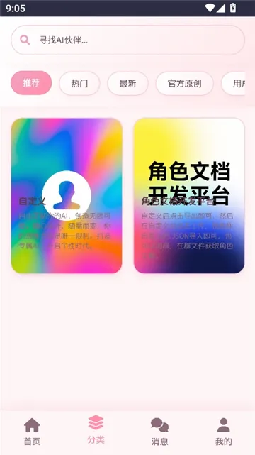 可按推荐、热门、最新等分类选择聊天模板,一键跳转聊天界面。