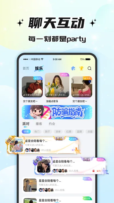 多元化场景娱乐:集成点歌、游戏、情感电台等丰富主题房,将社交与娱乐深度融合,互动氛围热烈且不尴尬。