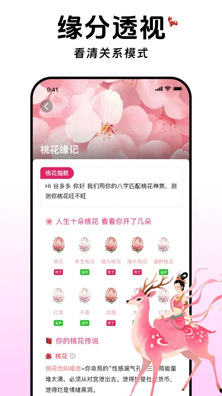 3、桃花指数:在线就能关注和查看自己的桃花指数,知道自己开了几朵桃花,还能查看桃花传说;