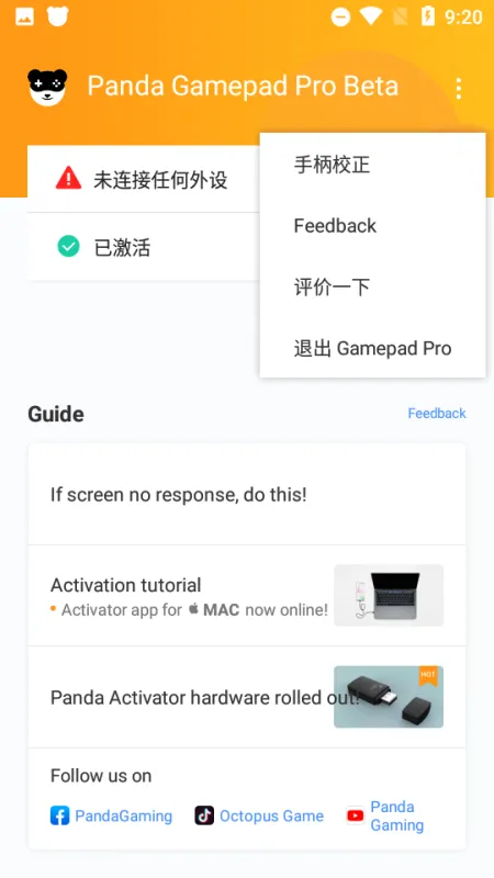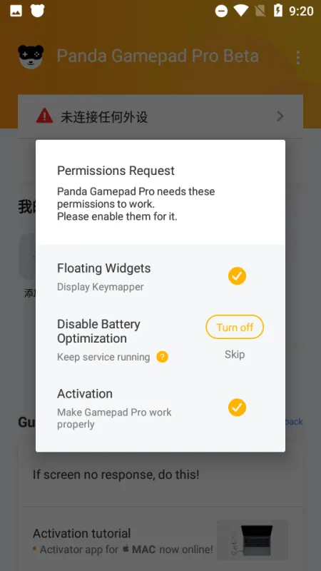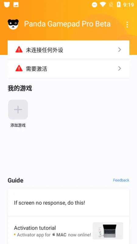刚上手的时候,熊猫手柄映射Pro会要求你获取Root权限或者通过PC来激活。选择PC激活的话,你需要把装好App的手机连接到电脑上,电脑上要运行一个激活程序。连接成功并激活后,就可以把手机和电脑断开了,然后把你的安卓设备接上手柄。搞定之后,屏幕上就会弹出设置界面,引导你调整手柄功能。