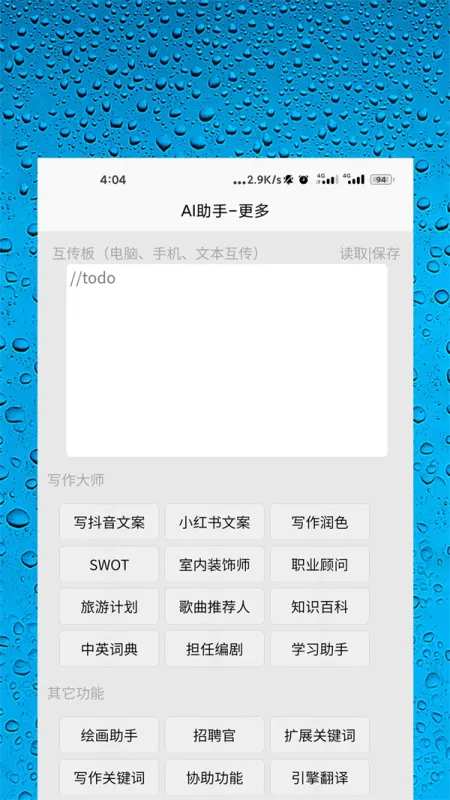 基于人工智能技术的智能应用程序,主要包括AI聊天问答、AI绘图、AI翻译、AI写作、AI生活助手等多个模块,可以帮助用户解决各种问题,提高工作和生活的效率。