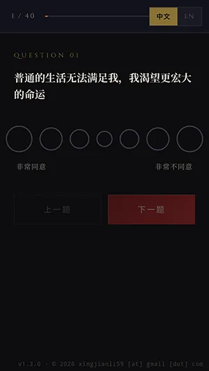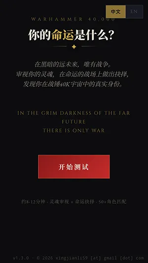 战锤 40K 人格测试是专为粉丝打造的趣味测评神器,深度还原战锤 40K 史诗世界观。40 道贴合原作设定的性格题,8-12 分钟完成,从处事逻辑到精神内核全面剖析。覆盖帝国、阿斯塔特、混沌、钛星人等全阵营,精准匹配 50 + 经典角色,生成带性格维度的星图报告与详尽阵营背景解读。免费无广告、结果可保存分享,既是娱乐测试,也是入坑科普,助你在黑暗银河中锚定专属身份。
