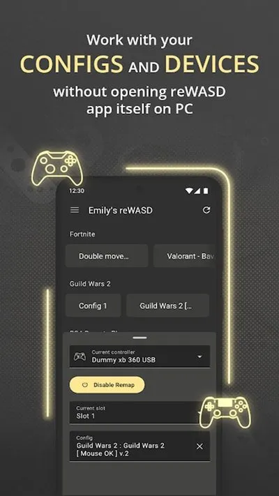 而且装了Junior之后,查配置、看映射、改设置这些事儿,就不用再跑到电脑前打开主程序了。直接在手机上找到装了reWASD的电脑,只要保证俩设备在同一个局域网里就行。搞定之后,你电脑上存的那些配置文件和连接的设备列表,手机上全看得到,还能直接“匹配”――就是把某个配置应用到指定的手柄上。