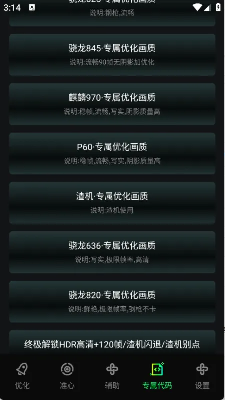 2、游戏配置:软件提供了游戏配置的功能,根据代码设置来配置游戏性能,一键配置游戏性能。