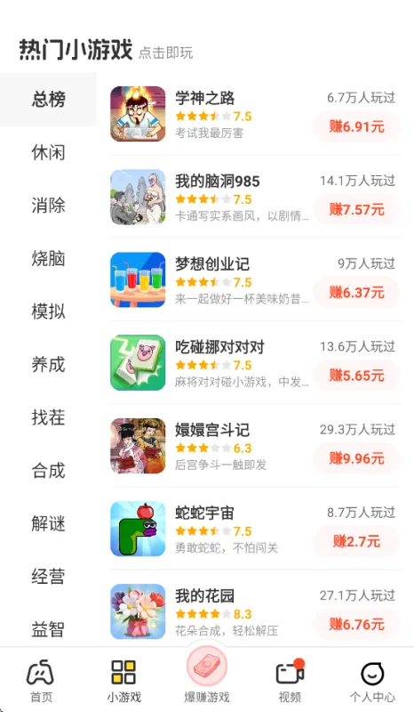 海量游戏资源:平台收录了多种热门休闲小游戏,涵盖益智、消除、闯关、模拟经营、角色扮演、动作格斗等多种类型,满足不同玩家的兴趣。