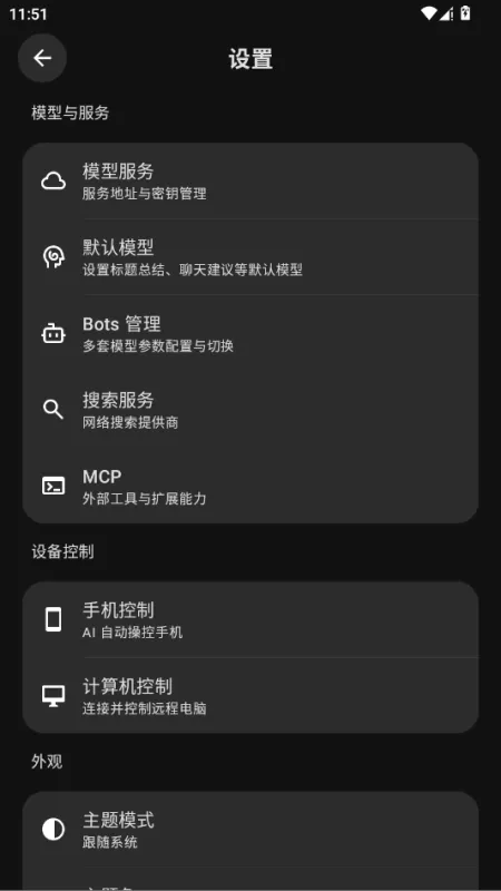 区别于多数仅聚焦 AI 模型调用、对话创作的聚合工具,Bothub 在整合 Ollama、DeepSeek、Kimi 等数十款主流 AI 模型的基础上,额外搭载设备远程控制能力,支持 AI 自动操控手机、连接并控制远程电脑,还整合了 Bing、秘塔等网络搜索服务,实现AI 能力 + 搜索 + 设备管理一站式搞定,一个软件满足多场景需求。