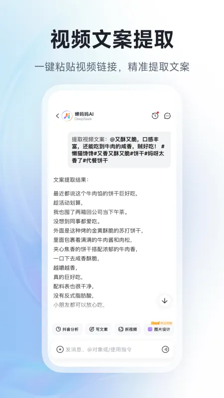 【爆款逻辑仿写】:输入商品信息或参考视频,AI可自动生成直播口播、短视频脚本及商品描述,支持像素级克隆爆款文案的结构。