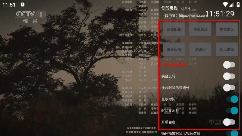 4.点击屏幕右边,就可以自由开启或者是关闭换台反转、换台时显示频道号、显示时间、时间显示秒等功能。