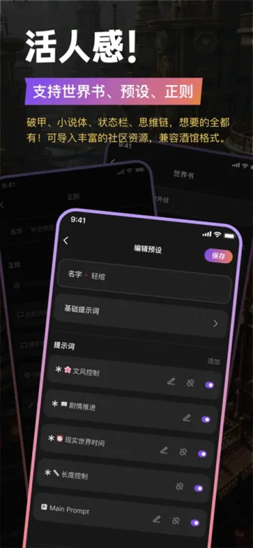 通过预设(Presets)调整AI回应风格(如写作风格、视角切换),防止对话中断,增强角色真实感。