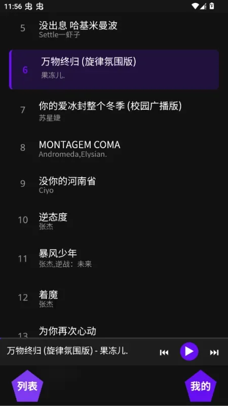 界面无复杂层级,核心仅分为列表和我的两大板块,「列表」页集中展示全量音乐资源,按曲目顺序排列,一眼就能看到所有歌曲;「我的」页单独设置打赏入口,功能板块泾渭分明,没有多余的分类和弹窗,新手打开就能上手操作。
