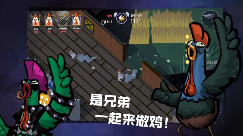 危鸡之夜是轻松搞笑的1V4非对称对抗生存手游。你可选择两大阵营:作为农场主里昂,用技能击倒并处决逃亡鸡;作为逃亡鸡,需分工破解 5 台电机开启逃生门,还能下蛋、治疗队友牵制追兵。搞怪卡通渲染,场景互动丰富,黎明狂暴机制让决战更刺激。高策略协作 + 高娱乐性,与好友联机尽享追逐与逃脱的双倍快乐,打造专属欢乐对局!