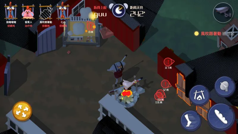 2、被救援后的鸡会处于受伤状态,如果撒了辣椒粉,就算被救援也只能在原地,只有过了时间才能行动,这让守夜者可以利用烧烤的逃生鸡来做诱饵,勾 引其他的鸡来拯救,最后一网打尽。