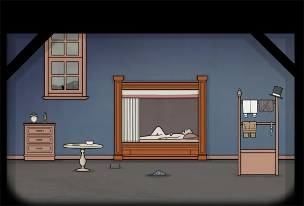 进入奥尔德斯卧室→取拖鞋、剃刀、碗具→依晨间流程便条(7点起床/刮须/早餐等)及‘忌脚冷’提示→设定闹钟为VII:XII→为他穿上拖鞋→剪除面部细毛(触发耳垂掉落)→用布擦拭→呈上粥碗→开窗引鸟食耳垂→获钥匙→取顶层浆果→加入粥中→依浆果堵孔逻辑消灭虫子→多次喂食至饱→按士兵步序(左-右-下-右-右-下)引导锻炼→依序穿戴衬衫→背心→领结。