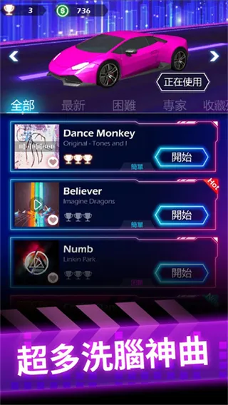 3、多样化的潮流音乐,可一边听歌一边挑战游戏的最高分;