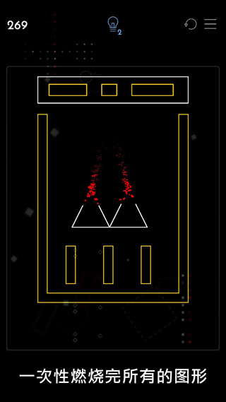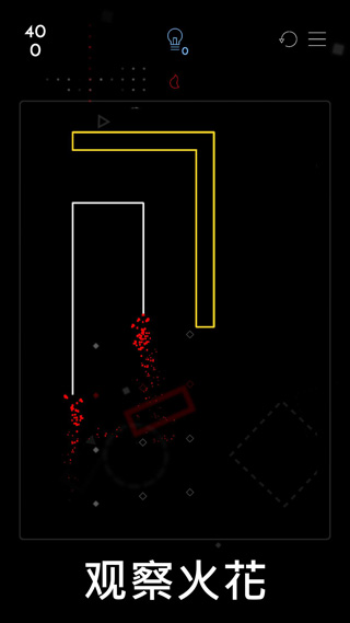 1、玩家需在每关中选择一个起始点点燃导火索,依靠燃烧路径与火星溅射触发连锁反应,最终点燃全部几何图形。