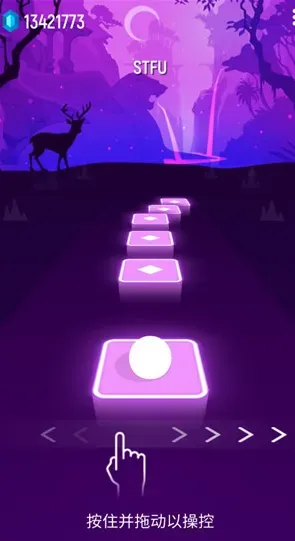 4、跟提示说的一样,按住屏幕拖动那个球,让它稳稳地落在下一个方块上就行。
