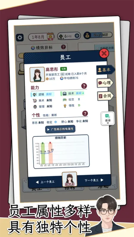 随机触发员工冲突、加班争议、跳槽危机等职场事件,需用专业HR思维权衡处理,不同决策会影响员工满意度与企业口碑,考验玩家的应变能力。