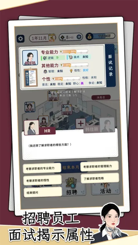 复刻真实职场的招聘闭环,涵盖简历筛选的关键词匹配、面试环节的压力提问、薪酬谈判的博弈技巧,甚至包含员工入职后的培训、调岗、离职处理等环节,细节贴合现实人力工作场景。