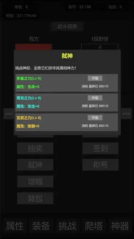 2.角色养成:升级属性、穿戴装备、掠夺神邸、收集神器。