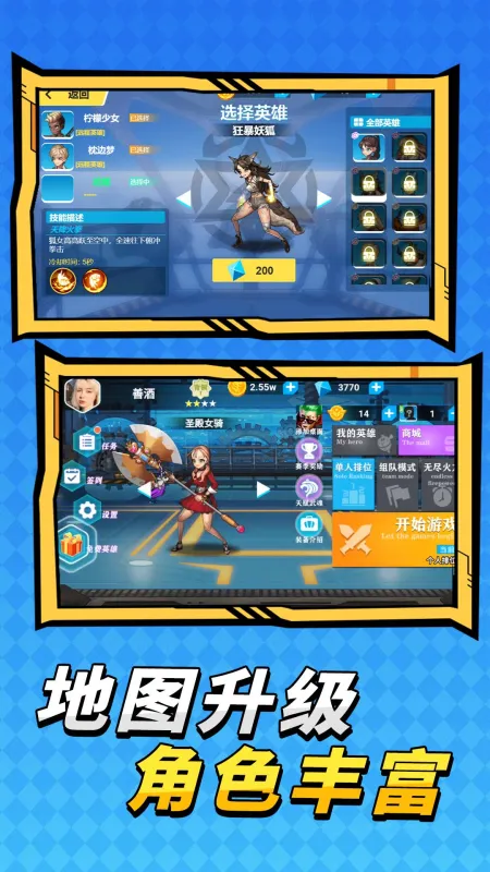 表情英雄: 游戏中的英雄均以各种流行表情为蓝本,玩家可以自由选择自己喜欢的英雄进行战斗。