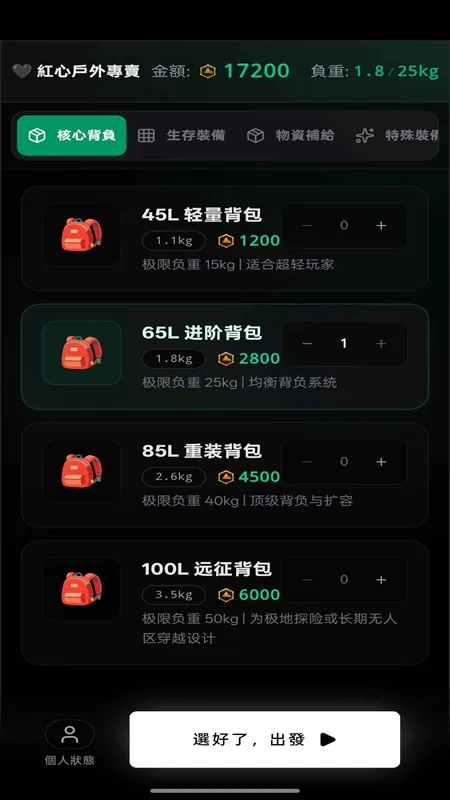 3、选择你需要背包、生存装备、物资补给、特殊装备等;